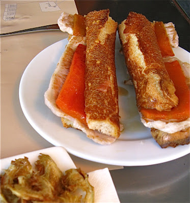 Et je me suis régalée d'artichauts frits, moi j'adore les artichauts! Des petits sandwiches de porc et poivrons et des champignons, lui il adore les champignons!